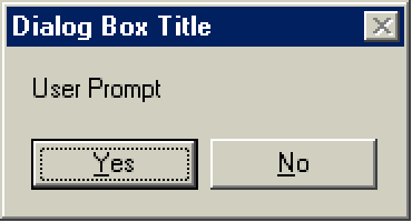 YesNoBox ( Result Variable , User Prompt , Dialog Box Title )