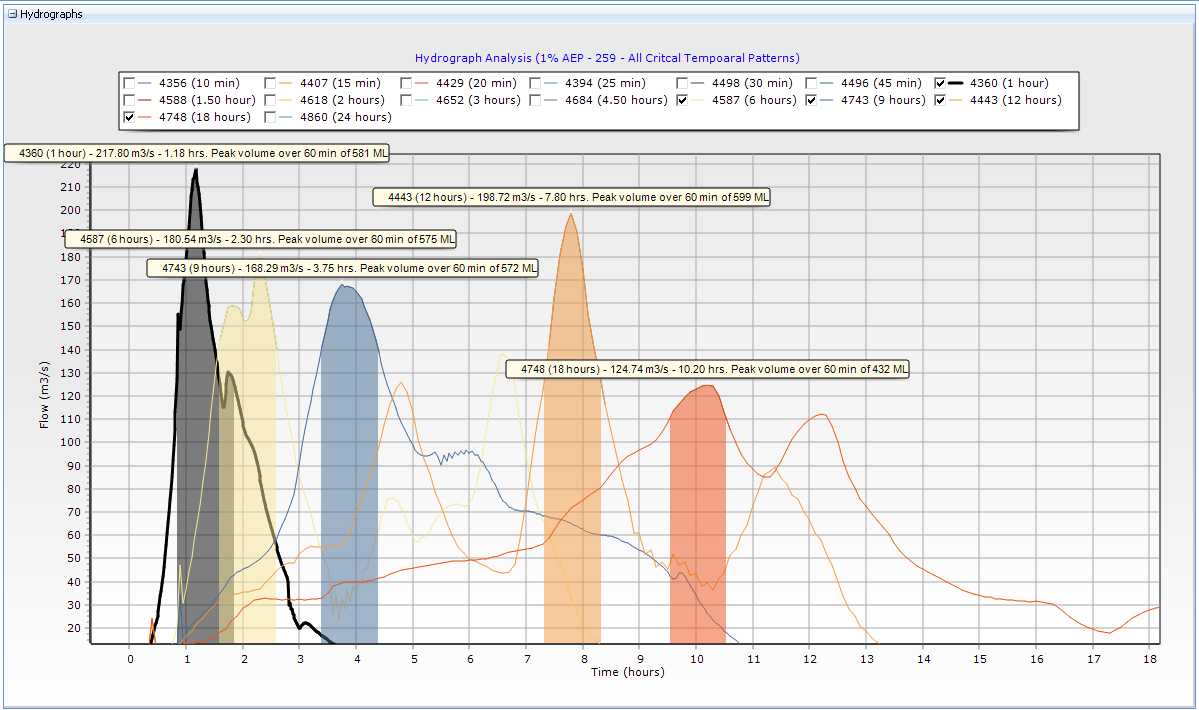 The hydrograph for any AEP, subcatchment, duration can also be plotted using the 'Hydrograph Charts' button. The hydrograph associated with the adopted temporal pattern will be displayed as a thicker line with a '(Critical)' suffix in the legend. Rainfall hyetographs can also be displayed using the 'Chart Rainfall' checkbox. The colours of the series can be edited using the Edit button. Labeling of peaks and rainfall values can be tailored via the Options panel.