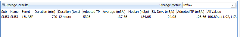 From Storm Injector 1.3.6 onwards, results for storages / basins in the model will be reported in the Storage Results panel. This panel reports the adopted temporal panel (based on the settings) and ensemble metrics including average median and standard deviation. The entire table can be configured to report on Inflow, Outflow, Stage or Volume based on the Storage Metric selected in the top right corner.