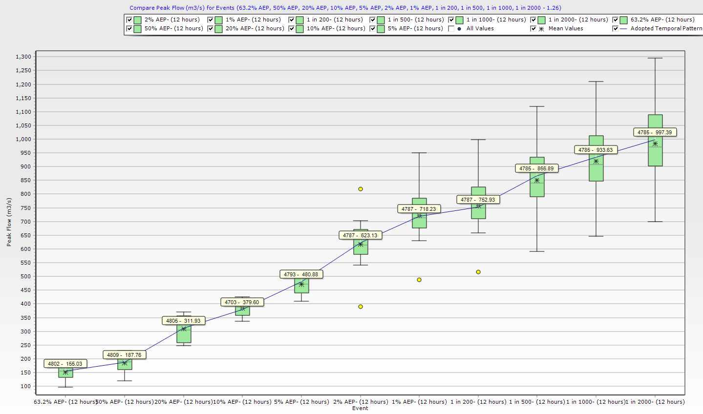 k.Click 5) Prepare Model Runs and then 6) Run Models. Once processed, you can compare the events using Box Charts and clicking Chart within the Compare Events panel. You can also click the 'Plot X as Log AEP (1 in X ) Years' option.