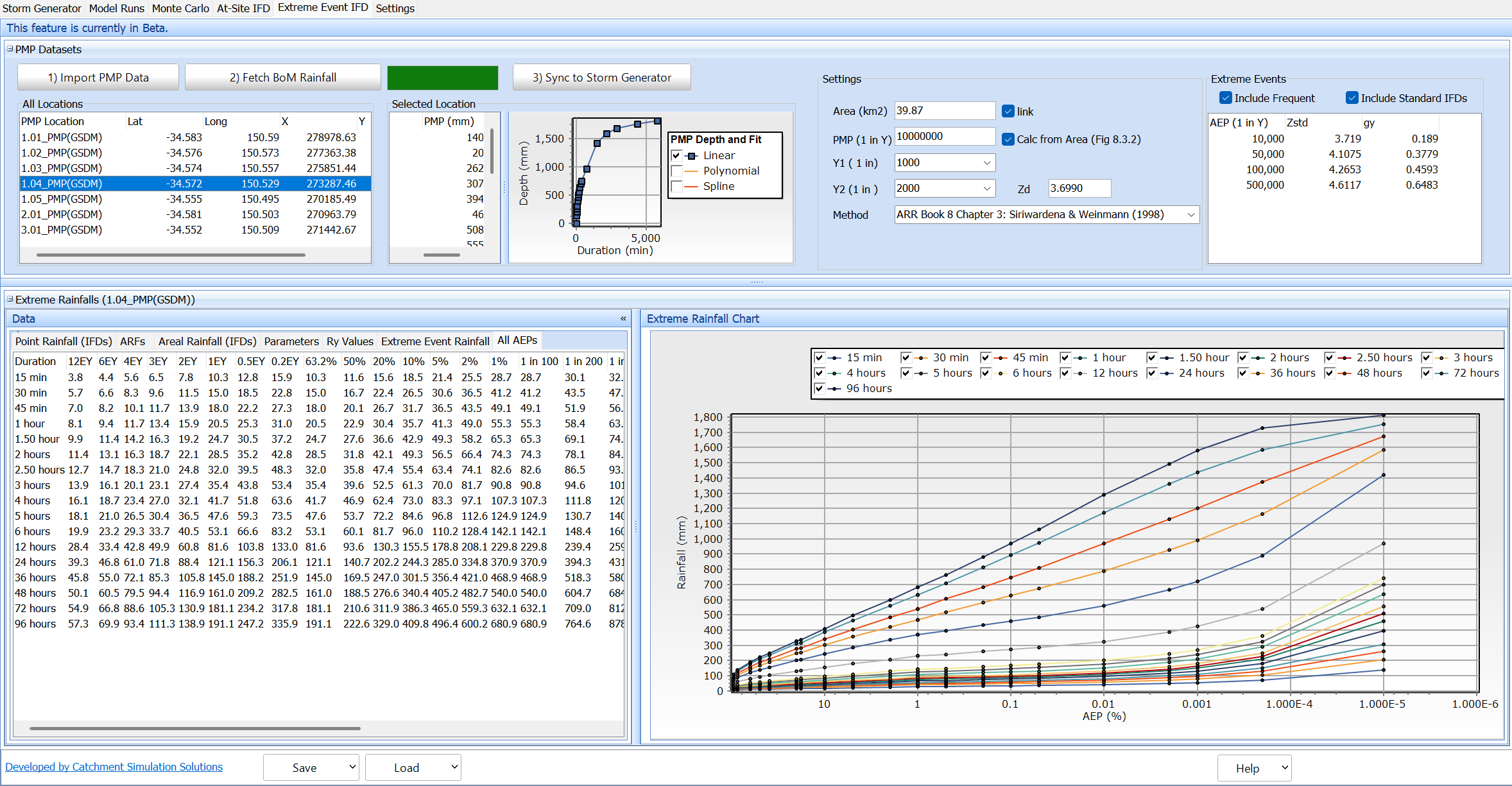 Storm Injector includes a feature to interpolate areal rainfalls between the 1 in 2000 and the PMP based on user supplied PMP data. The user may customise which events will be interpolated as well as the AEP of the PMP (which is by default estimated based on Figure 8.3.2 from ARR). Once rainfall data is interpolated, it can be sync'ed to the Storm Generator tab where it can be used to prepare storms for extremely rare events.