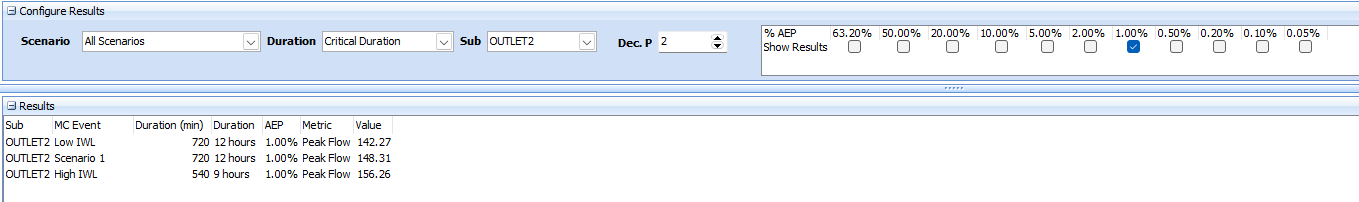 16.Create a new MC Scenario called 'Low IWL' and select the 'ex3_Storage_partfull_100.wbn' when clicking 2) Prepare MC Runs. Click 3) Run and wait for the results to process. Create another scenario called 'High IWL' and select the 'ex3_Storage_partfull_105.wbn' when clicking 2) Prepare MC Runs. Click 3) Run and wait for the results to process. You can compare the 1% Peak Flow results at the outlet as shown in the image below. It can be seen that the 1% AEP model peak outflow increases with a higher IWL assumption.