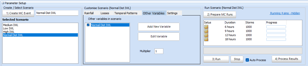 Finally, we will use the Monte Carlo Variables to examine the results when using a stochastically generated number transformed through a distribution to cater for the uncertainty in the Initial Water Level (IWL). We will try both a Normal distribution of IWL as well as a Cumulative Density Function (CDF) approach.